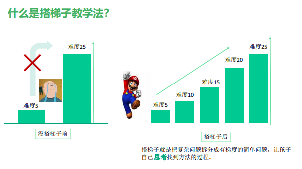 采用“搭梯子教学法”,将复杂的问题拆分成有梯度的简单问题,激发孩子主动思考能力,让孩子自主找到解题方法,培养孩子主动思考习惯。